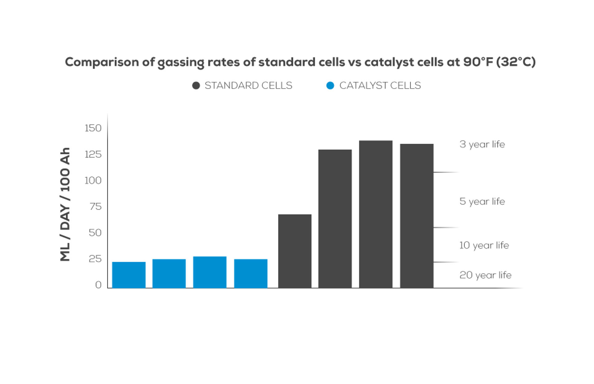 Figure 2. Comparison of gassing rates of standard cells versus catalyst cells at 90°F (32°C), showing an increase in theoretical service life.
