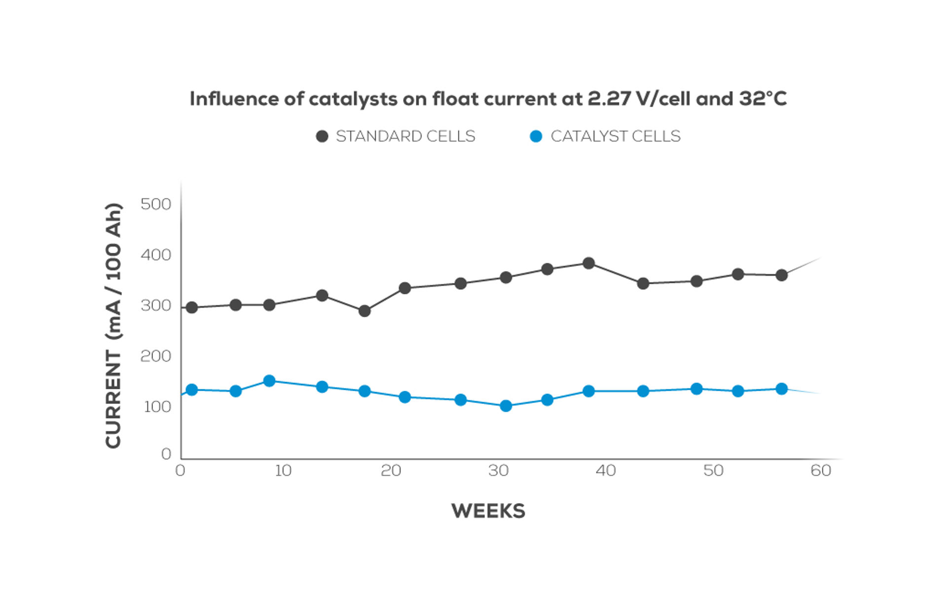 A Microcat catalyst provides an immediate and observable drop in the float current, leading to a reduction in water loss, positive plate corrosion, cell temperature and energy usage and costs.