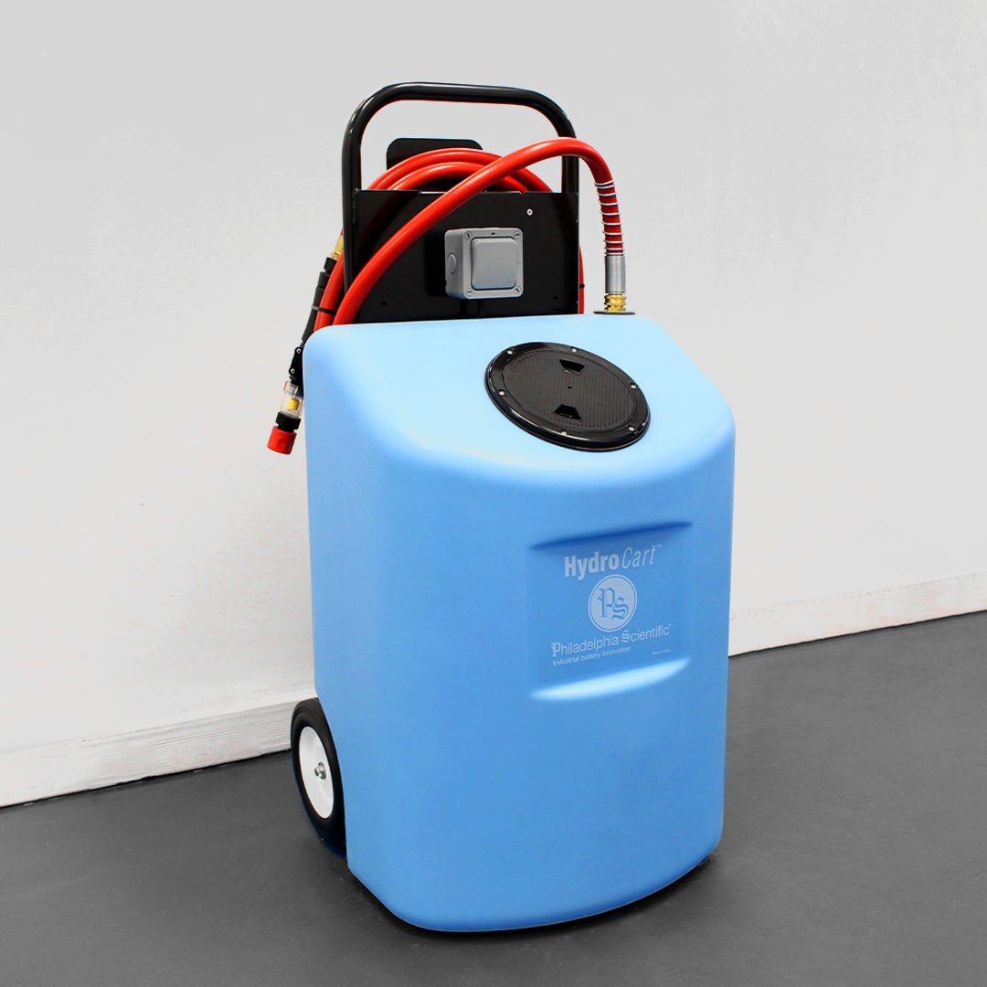 This sturdy 20 gallons (75.7L) high density polyethylene tank easily transports water to your batteries. Fill the tank with water from any available deionized water source. The HydroCart handles like a hand truck and is powered by AC. When the switch is turned on, the pump is activated.