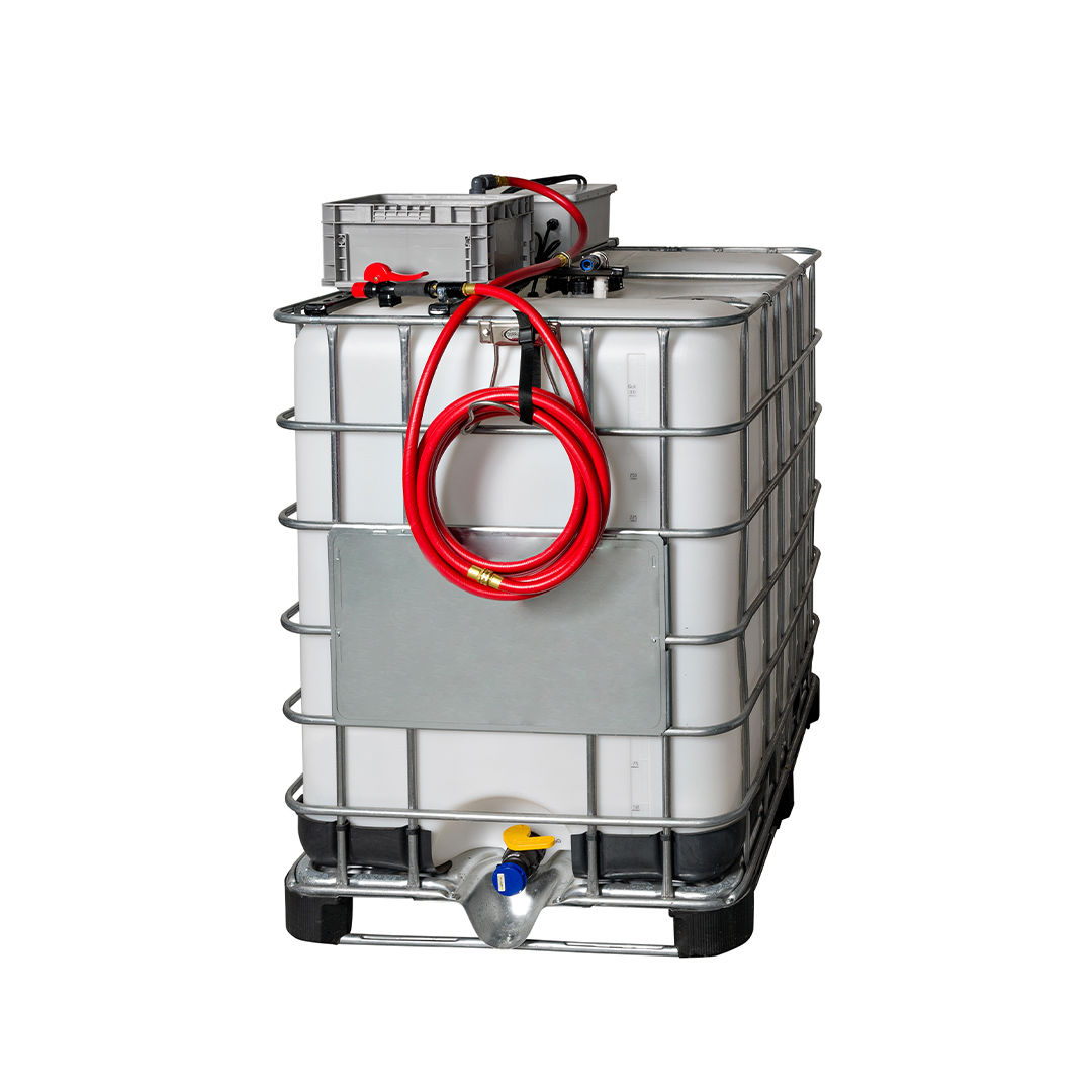 Hardware mounts to the metal frame of the 300 gallons tank. Hardware includes a submersible pump and control unit.